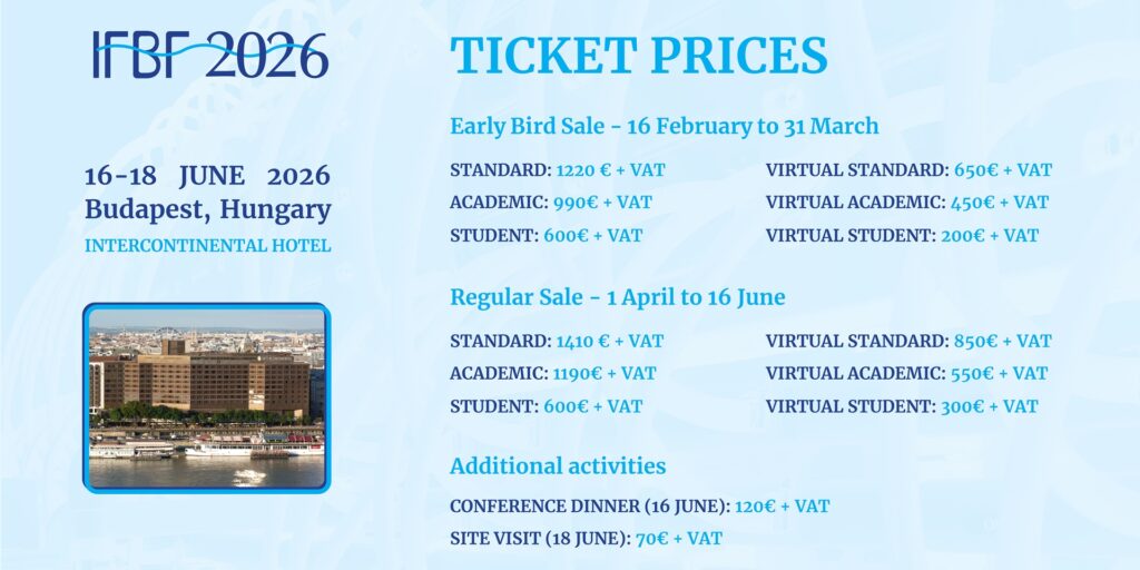 All tickets for IFBF include access to three days of conference, exhibition area, poster session, and cocktail reception on Day 2. All prices are to be considered + VAT