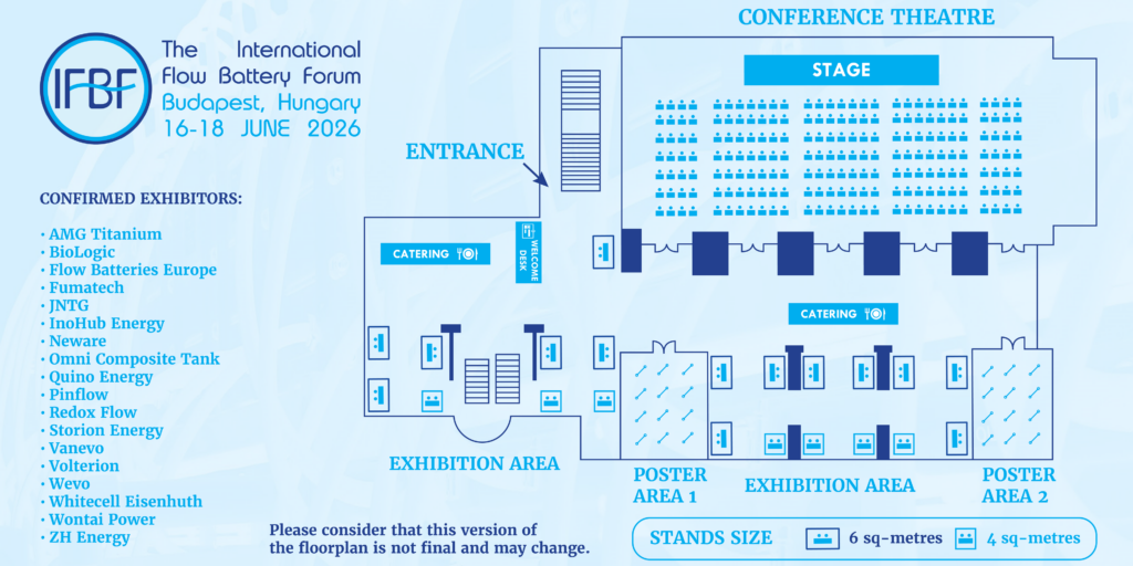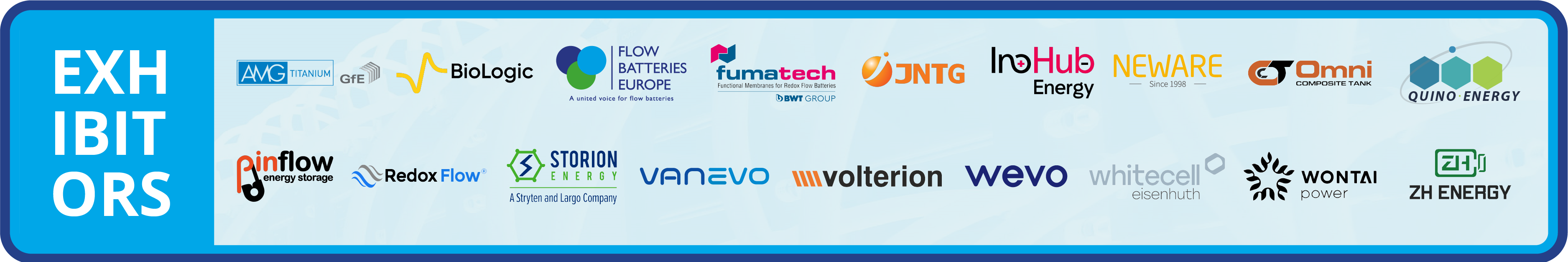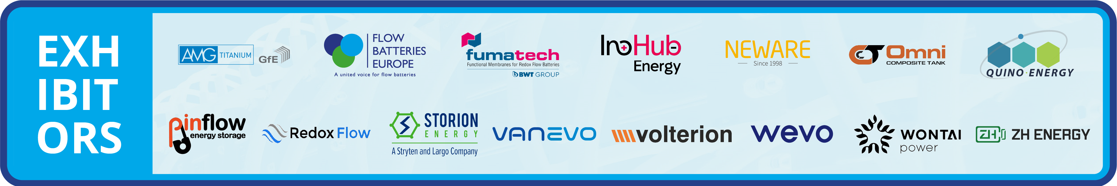 Exhibitors: AMG Titanium / Flow Batteries Europe / Fumatech / InoHub Energy / Neware / Omni Composite Tank / Quino Energy / Pinflow / Redox Flow / Storion Energy / Vanevo / Volterion / Wevo / Wontai Power / ZH Energy